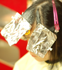 縮毛矯正の1剤を前髪のくせ毛部分に付けます。アルミホイルを使って薬の付いた髪が顔にかからないように注意を払います。 |