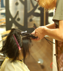 完全に乾いたら前髪からもみ上げ付近までストレートアイロンをかけ縮毛矯正をかけます。 |
